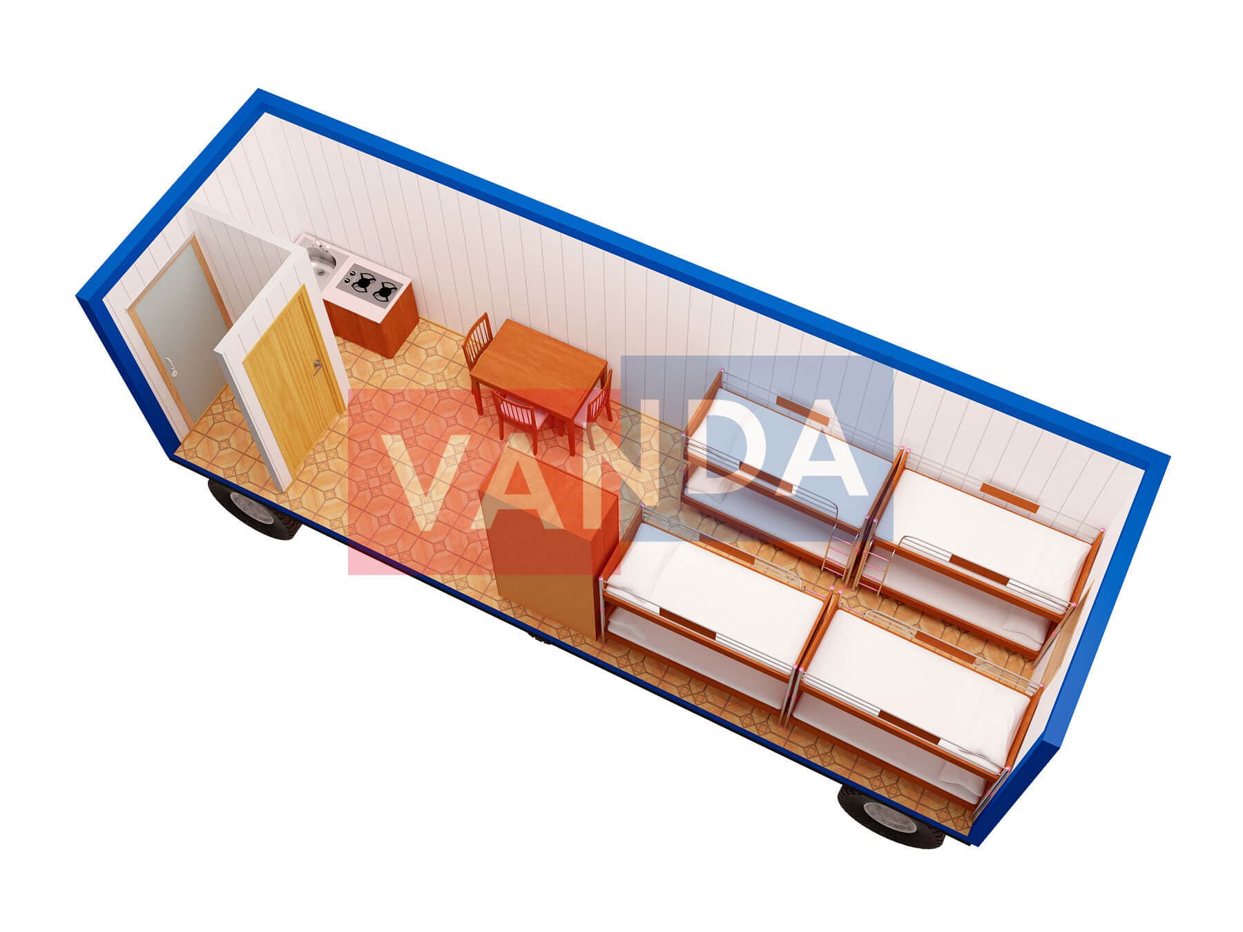 Мы сами изготавливаем жилой вагончик на шасси 8,0 x 2,4, общей площадью 19.2 квадратных метров, имеющий наиболее доступную цену в нашем каталоге, и предлагающий широчайшие возможности для модернизаций. Простое решение с минимальными затратами.