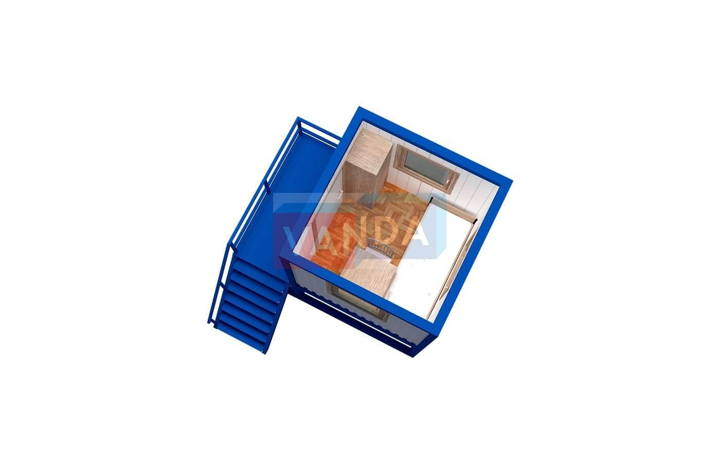 Пост охраны на подиуме №2 (вариант 2) изготавливается из несущего каркаса (верхняя и нижняя обвязка): швеллер 100х50х3 мм., угловые стойки: сложно - гнутый угол 90х90х3 мм., крыша блок-контейнера: металл сварной 0,9-1 мм., качественная наружная отделка: оцинкованный профлист, вспомогательный деревянный каркас (стены) выполнен из брусок 40х75 мм., лаги пола: обрезная доска 40х100 мм., лаги потолка: обрезная доска 40х100 мм., выполнено утепление: Минеральная вата «ISOVER» – 50 мм. и пароизоляция: плёнка техническая, черновой пол состоит из: обрезная доска 20 мм. (2 сорт), чистовой пол покрыт: ДСП строительное 16 мм., отделка пола выполнена из качественных материалов. Контейнер комплектуется окнами: деревянное, двойное остекление 800х1000, входной дверью: ДГ 21-8 обшита снаружи оцинкованным листом, врезной замок и внутренними дверями. Если в БК присутствуют перегородки, то для них используется: брусок 40х50 мм. Лестница постамента имеет перила, тетива лестницы выполнена из профтрубы 30х60 мм., ступени из уголка 25х25х3 мм., просечной лист, перила из профтрубы 20х40 мм., площадка перед входной дверью имеет ограждение.